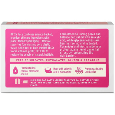 Directions: Wet bar and lather in hands. Massage onto damp skin. Be sure to double cleanse to fully remove sunscreen or makeup. Rinse and gently dry with a clean towel. One BRIXY bar lasts longer than two 8oz plastic bottles. For the best long-lasting results, store in a dry place.