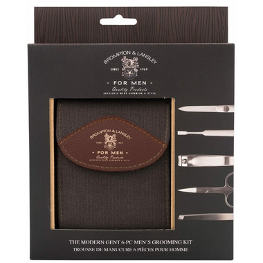 Brompton & Langley's stunning grooming set features 5 high-quality stainless steel tools in a matte satin finish especially designed to keep mens tough nails neat and trimmed. Set in a stylish waxed canvas case with leather accents, it is the perfect travel companion for the well-groomed man.