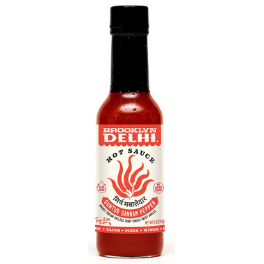 Brooklyn Delhi Hot Sauce made with Guntar Sannam Pepper, smokey Indian chilies, tangy tomato, and sweet garlic. Try it on tacos, pizza, wings, etc.