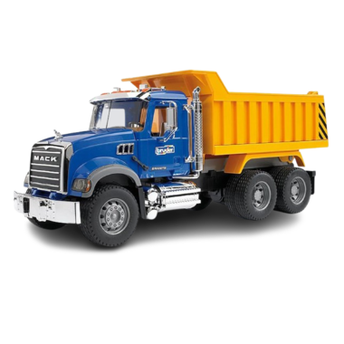 The Mack Granite Dump Truck by Bruder Toys offers children realistic and active fun. This highly detailed truck features a realistic driver's cabin with doors that open, adjustable side-view mirrors, a tilting engine bonnet which provides a full view of the engine block, and many other features which give these trucks their beautiful chrome look. Like a real dump truck, the open-box bed lifts at the front and tilts allowing the content within to be deposited.