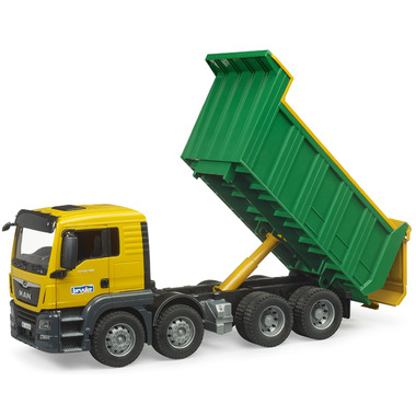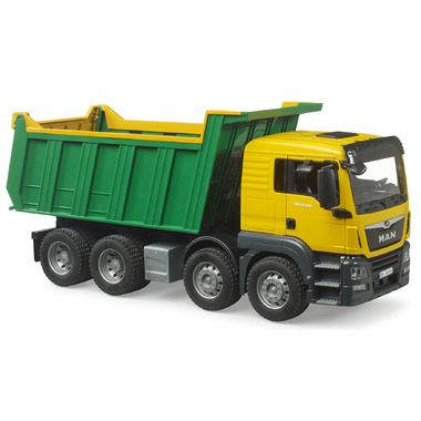 The MAN TGS is the perfect, all-round vehicle for construction sites, long-haul deployment and local distribution. Thanks to durable design, featuring powerful engines and providing an over-average payload, this truck is the prototype of the frequently described "all-round vehicle" with plenty of innovations on board. The two-tone cab features doors that can be opened to provide any bworld figure with a modern place of work. The large truck tipping trough has a tailgate that opens automatically when the load is tipped. The MAN tipper truck is equipped with four axles and robust tread tyres for heavy-duty use.