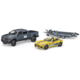 - Includes Trailer with modern design featuring folding platform, cable winch and wheel chocks, Driver with helmet, BRUDER roadster with removable roof and wheel changing system