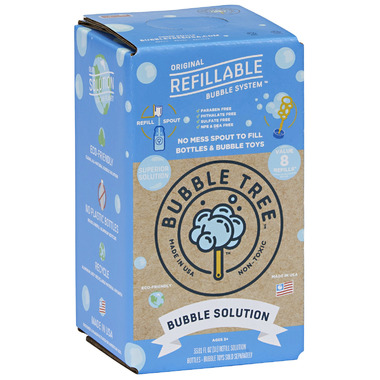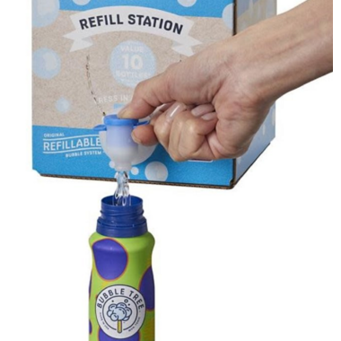 Original Refillable Bubble System. The perfect way to refill all your bottles and bubble toys! Includes 1 litre of eco-friendly superior bubble solution. Features no-mess easy dispensing refill spout to refill aluminum bottles and bubble toys. The total value of 8 bottles of bubbles.