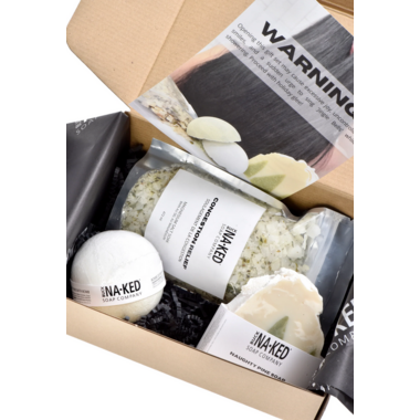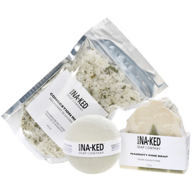 Congestion Relief Salt Soak: Magnesium Chloride, Mentha piperita, Mentha spicata, Eucalyptus Globulus, Eucalyptus Globulus Leaf Oil, Melaleuca Alternafolia (Tea Tree) Leaf Oil, Eucalyptus Globulus Leaf Oil, Mentha Piperita (Peppermint ) Oil Naughyty Pine Soap: Elaeis Guineensis, Aqua, Cocos Nucifera (Coconut) Oil, Sodium Hydroxide, Ricinus Communis (Castor) Seed Oil, Chlorella vulgaris powder, PINUS SYLVESTRIS LEAF OIL, Juniperus Virginiana L., Eucalyptus Globulus Leaf Oil Naughty Pine Bath Bomb: Sodium Bicarbonate, Citric Acid, Sodium Chloride (Sea Salt, Dead Sea Salt), Magnesium Sulphate, Carthamus Tinctorius (Safflower) Seed Oil, Aqua, PINUS SYLVESTRIS LEAF OIL, Juniperus Virginiana L., Eucalyptus Globulus Leaf Oil, Chlorella vulgaris powder