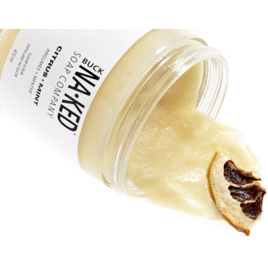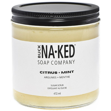 Buck Naked's Citrus + Mint Sugar Scrub gently exfoliates while it cleanses, leaving your skin silky and smooth.