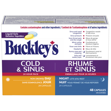 Sick of being sick? Get liquid-fast daytime and nighttime relief from your cold and flu symptoms with Buckley's Cold & Sinus 24-Hour Pack Liquid Gels. The non-drowsy Cold & Sinus Day Liquid Gels get to work fast to relieve headache, aches and pain, fever and chills, sore throat pain, sinus and nasal congestion, and dry cough. Giving you the fast relief and rest you need, the Cold & Sinus Night Liquid Gels add an antihistamine to relieve runny nose, sneezing, and itchy and watery eyes.