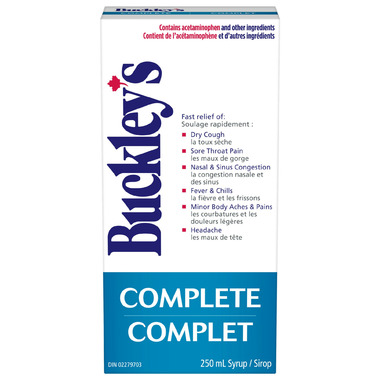 Buckley’s Complete Syrup 250mL gives cold and flu symptoms a taste of their own medicine. Get fast-acting all-in-one relief from dry cough, sore throat pain, fever and chills, nasal and sinus congestion, headache, and minor aches and pains. To be sure this product is right for you please read and follow the label.