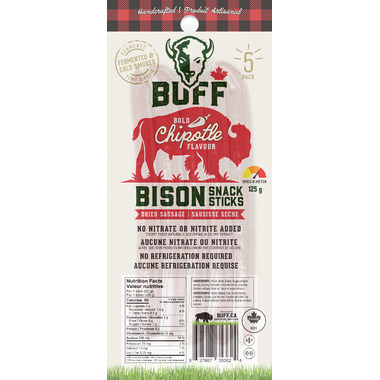 Buff Bison Snack Stick Bold Chipotle, handcrafted dried sausage fermented and cold smoked.