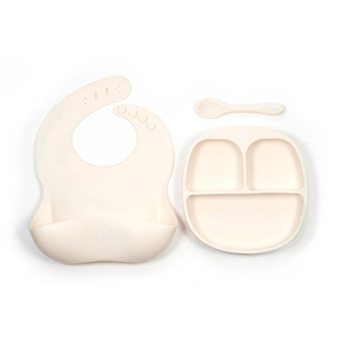 Here is the perfect starter set for your little one's mealtime. They can discover the joy of eating without making a mess! The silicone plate is practical, easy to clean, and its suction cup ensures an unparalleled grip. The bib, meanwhile, is adjustable and fits all babies from 6 to 36 months. Its the ideal set to support your little one in developing their independence during mealtime! This 100% silicone set includes: a plate, a spoon, and a bib.