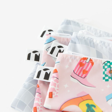 An alternative to single-use plastic bags, Bumkins reusable Large Snack Bags/sandwich bags are made from the same waterproof fabric as the award-winning SuperBib. A smooth zipper closure locks in crumbs, and single-ply construction means no worrying about icky stuff growing between layers of fabric. Great for food and fun, snack bags help organize lunches, toys, electronics and more. They'll even fit a bagel!