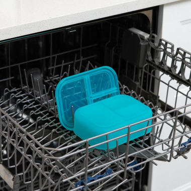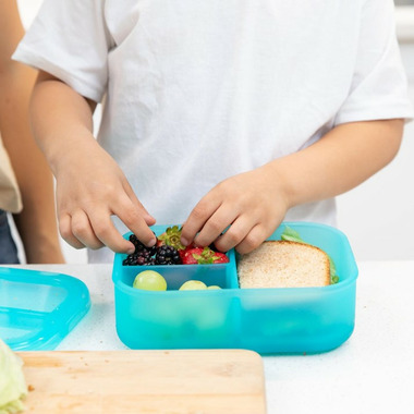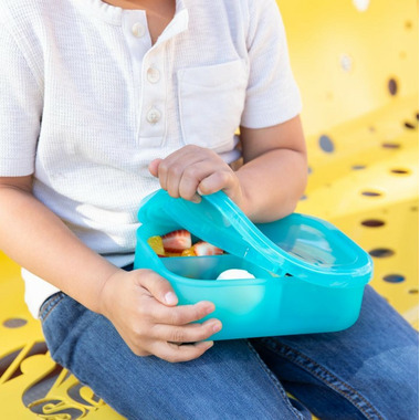 Bumkins' Jelly Silicone Bento Box - a delightful lunchtime solution for kids! Made from 100% food-safe premium LFGB grade silicone, this versatile container is designed for leftovers, meal prep, or snacks-on-the-go. With three deep-walled sections, a leak-resistant lid, and a non-skid base, it ensures food stays seperate, portion-controlled, and secure. The colorful translucent silicone makes content identification a breeze, while the compact size fits most standard lunch boxes. The wet or dry-erase marker-friendly surface allows for easy labelling or dating.