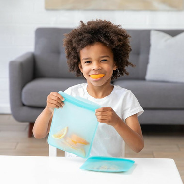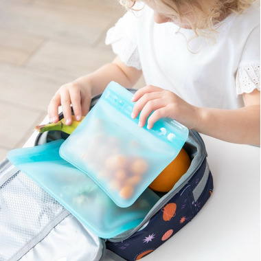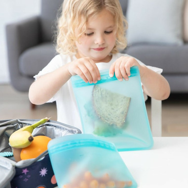 Say goodbye to single use plastics with Bumkins' reusable flat-lay Silicone Storage Bags! An eco-friendly solution that is tailored to fit a standard size lunch box, designed with kiddos in mind. Featuring a child-friendly zip seal, easy-to-pull tabs, and fun zipper markers to let little ones take the lead at mealtime. When it's time to store, they're compact and collapse flat to place in drawers or other small areas around the home. Crafted from food-safe, leak resistant platinum silicone, they feature rounded corners for easy cleaning and a frosted design for fast food identification. Save space, reduce waste, and let your little ones shine - one zip at a time.