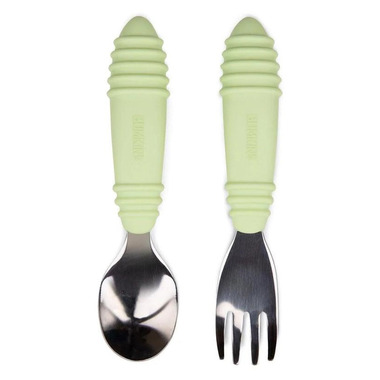 Little ones can dig into mealtime with Bumkins Spoon + Fork Set! Stainless steel fork and spoon heads are sized and shaped for toddlers. The concave heads help keep food on the fork or spoon, helping promote self-feeding with solid foods. The outer fork tines are bent to help spear food and help keep food on the fork. Handles are textured silicone so they are easy-to-grip. Safe to use - made from 100% food-safe silicone.