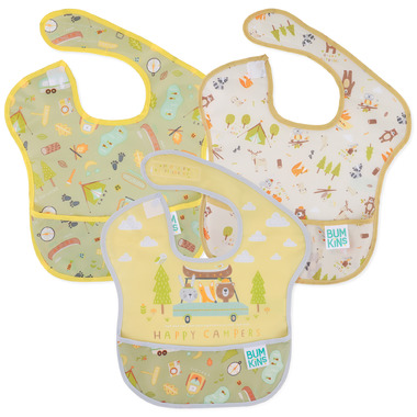 Bumkins SuperBibs save you from the mess! The SuperBib attaches over the back of the shoulder with hook and loop closure for a quick, adjustable and tug-proof fit. With a handy crumb catcher / catch-all pocket for containing spills. Made from Bumkins' lightweight, waterproof, easy-wipe, stain and odor resistant fabric. Single ply construction means no worrying about icky stuff growing between layers of fabric. Without a cotton layer, stains and smells don't stick. Wipeable and machine washable for easy cleaning so you can use it over and over again. A pack of 3 ensures you have a clean one handy!