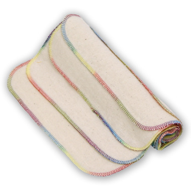 Bummies Cotton Wipes are made of 100% unbleached cotton flannel. They are 1-ply, and at 8" x 8", tiny enough to tuck into your pocket. They're soft and practical, with just a touch of whimsy in the rainbow stitching.