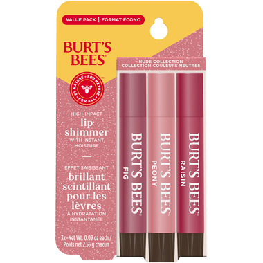 - LIP SHIMMER: Three 0.09 oz. tubes of Burt's Bees Lip Shimmer in Fig, Peony and Raisin to help you achieve soft, bright and shimmery lips