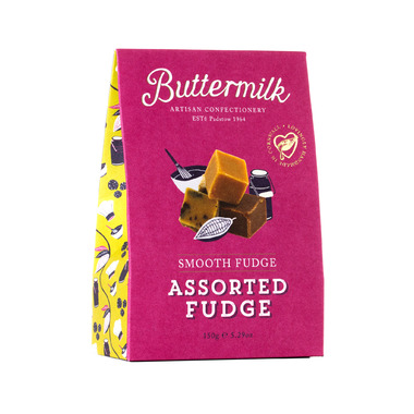 Buttermilk Confectionery Co. Assorted Fudge is a luxurious assortment of traditional smooth fudge with indulgent Clotted Cream, scrumptious Cookies and Cream and deliciously intense Chocolate.