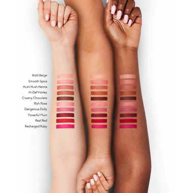 Real Red: Ingredients: Dimethicone, Hydrogenated Microcrystalline Wax, Synthetic Beeswax, Polybutene, Neopentyl Glycol Diheptanoate, Trimethylsiloxysilicate, Copernicia Cerifera (Carnauba) Wax (Cera Carnauba/Cire De Carnauba), Isododecane, Isoamyl Laurate, Persea Gratissima (Avocado) Oil, Palmitoyl Tripeptide-1, Tocopherol, Helianthus Annuus (Sunflower) Seed Oil, Ethylhexyl Palmitate, Tribehenin, Sorbitan Isostearate, Lactic Acid. May Contain/Peut Contenir (+/-): Mica, Titanium Dioxide (Ci 77891), Iron Oxides (Ci 77491, Ci 77492, Ci 77499), Blue 1 Lake (Ci 42090), Carmine (Ci 75470), Manganese Violet (Ci 77742), Red 7 (Ci 15850), Red 27 Lake (Ci 45410), Red 40 (Ci 16035).