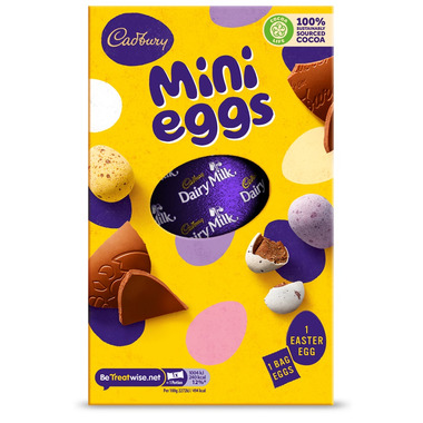 UK Special Edition Cadbury Mini Eggs includes 1 Easter egg and 1 bag of eggs. With 100% sustainably sourced cocoa.