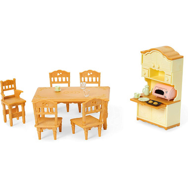 Dining Room Set includes a dining table and baby chair suitable for up to 5, and a delightful kitchen cabinet for storing kitchenware. Dining Room Set features a tea set and toaster oven that can be stored in the kitchen cabinet. The dining table comes with 4 chairs for both adults and children, and a baby chair.