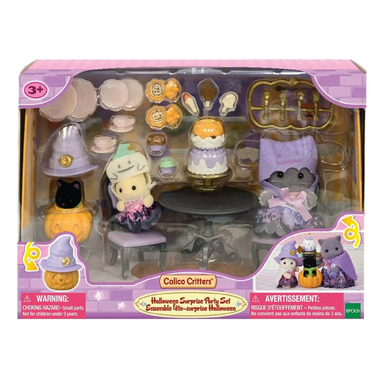 This playset features a girl, baby and cradled baby with a table, chairs, sweets and accessories for a Halloween party. There are lots of fun features—cloaks that transform the characters into spooky Halloween creatures, a cake that changes its shape, a jack-o'-lantern to hide in, and more!Turn over the Persian Cat girl and Tuxedo Cat baby's cloaks to make spooky Halloween costumes! Turn over the berry shortcake to turn it into a fancy two-layered cake! You can insert chocolate decorations and candles in the cake and cupcakes.The Midnight Cat cradled baby fits inside the jack-o'-lantern. Put the hat on the jack-o'-lantern to hide him! The back of the jack-o'-lantern can be used as a baby sofa.