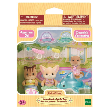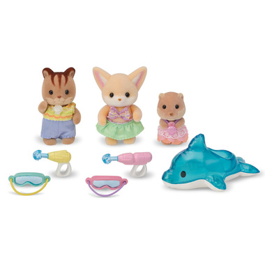 The Nursery Friends - Pool Fun Trio set is the perfect addition to any nursery playset! Contains three babies. The inflatable dolphin and pool toys provide lots of fun in the pool. Cradled babies can ride the inflatable dolphin. The babies are wearing cute swimming costumes with wave patterns and shell buttons. The babies can hold the pool toys and wear the goggles. The Fennec Fox baby is Yulie, the Walnut Squirrel baby is Ambrose and the Splashy Otter cradled baby is Nicola. Combine with Sunny Castle Nursery, Rainbow Fun Nursery Bus, Nursery Swing, Nursery Sandbox & Pool and Flora Rabbit Family (sold separately) for even more fun. Combine with baby and cradled baby figures (sold separately) for even more fun, imaginative playtime!
