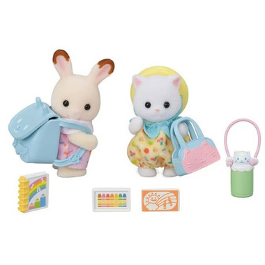 The Nursery Friends - Walk Along Duo set contains two babies who are ready to go to the nursery—the perfect addition to any nursery playset. This set contains accessories such as a rucksack, hat and water bottle—everything the babies need for the walk to the nursery. The babies are wearing cute, colorful clothes. The babies can wear and hold the rucksack, tote bag, water bottle and hat. The crayons and sketchbook can be put in the rucksack or tote bag. The Chocolate Rabbit baby is Crème and the Persian Cat baby is Ryan. Combine with Sunny Castle Nursery, Rainbow Fun Nursery Bus, Nursery Swing, Nursery Sandbox & Pool and Flora Rabbit Family (sold separately) for even more fun. Combine with baby and cradled baby figures (sold separately) for even more fun imaginative playtime!