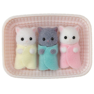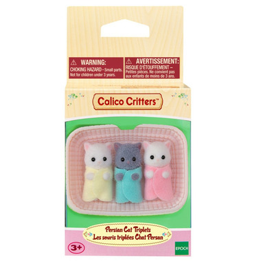 Calico Critters miniature dollhouses, playsets and figures are timeless and classic high-quality toys. Persian Cat Triplets have fluffy fur. You can have all three triplets sleep in the included cradle. Girl triplet Blair (yellow outfit) is mischievous and likes to pull on plants and the ribbons of her sister's dress. Boy triplet Blake (green outfit) loves the smell of mint and the sound of leaves moving in the wind. Girl triplet Briana (pink outfit) grows up the quickest of the three, and was first to roll over while asleep. Combine with Persian Cat Family and Persian Cat Twins for more enjoyable play (sold separately). All figures have heads that turn.