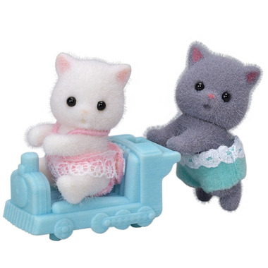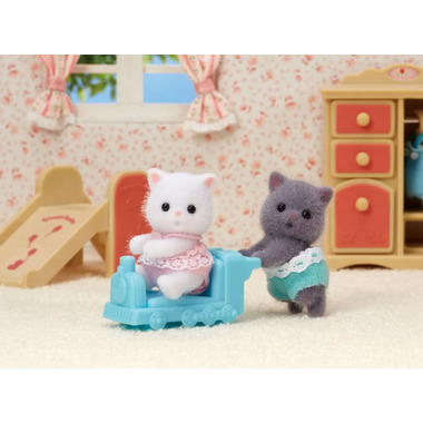 Includes sitting and crawling twin figures Bellamy and Leah Hopscotch Rabbit, and baby blue pushcart vehicle accessory. Flocked figures that are soft to the touch and perfectly miniature for little hands. Twins are dressed in removable detailed clothing, and are poseable with heads that rotate. Approximately 3.8 cm tall. Play independently or together with Calico Critters dollhouses, furniture, and accessories.