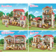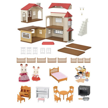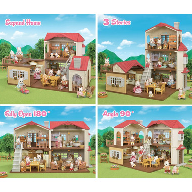 Red Roof Country Home Gift Set, the large, red-roofed Hopscotch Rabbit Family home set, includes both figures and furniture. Red Roof Country Home Gift Set can be opened up for play at 90-degrees, 180-degrees, and any angle in between. Closing up the house creates the appearance of a wonderful home, no matter which angle you look at it from, with light spilling out through the windows making quite the sight to behold. The second floor room on the left side, and the roof on the right side are removable. Placing this room on top of the roof, or placing the roof on top of the terrace creates a large, three-story house to play with. Both Hopscotch Rabbit Girl and Hopscotch Rabbit Mother are included. Have fun using the furniture included to create and play with a kitchen, children's playroom, bedroom, etc.