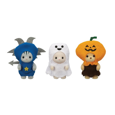 Trick or Treat Trio is a limited edition seasonal Halloween set which includes a trio of pose-able costumed Calico Critters baby figures. Baby figure styles are the Grey Cat baby in bat costume, Silk Cat baby in the ghost costume and Cuddle Bear baby in the Jack-O-Lantern costume. The costumes are removable and compatible with other baby size figures from Calico Critters. Collect all Limited Edition Seasonal Sets from Calico Critters including the Spooky Surprise House and Mr. Lion's Winter Sleigh.