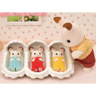 The Triplets Care Set is a set of furniture for taking care of the cute, little Chocolate Rabbit cradeld baby triplets. The girls are wearing red and mint-green clothes, the boy is wearing yellow. Sit them in their baby chairs to feed them, and put them to sleep in the crib.