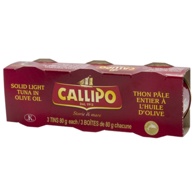 Solid light tuna in olive oil. Includes three tins, 80g each.