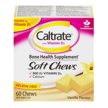 A simple way to help supplement your daily calcium requirements. Caltrate Soft Chews are a great alternative to taking calcium tablets for adults and children six years and older. Offering a good source of calcium and vitamin D, Caltrate Soft Chews support the development and maintenance of healthy bones and teeth, while also helping prevent bone loss and osteoporosis.* Caltrate Soft Chews contain 600 mg of calcium plus 800 IU of vitamin D3 to help maximize calcium absorption to nourish strong bones and support muscle function. The #1 doctor-recommended calcium supplement brand in Canada,** Caltrate Soft Chews are gluten free (contains lactose). This package includes one 60-count bottle of vanilla-flavoured Caltrate Soft Chews. (*Adequate calcium as part of a healthy diet may help prevent bone loss and osteoporosis. ** Based on IMS Health Data dated March 2018)