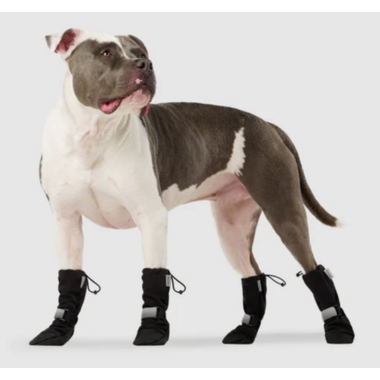 The ultimate dog boot that's easy to put on, stays on and protects their paws from the elements! Protects against snow, rain and mud. Canvas material that allows your pup to feel the ground. Ultra-wide opening and rubber grip on sole. Insert paw, adjust toggle at top of boot, wrap reflective strap around and use a hook-and-loop closure to secure in place.