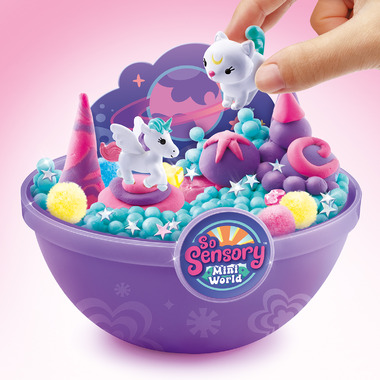 Open the sphere and create a mini world with all the pieces included, deco, compounds, figures and more. Place the top and display. Collect all 3 worlds: Mermaid, Tropical, and Cosmic.