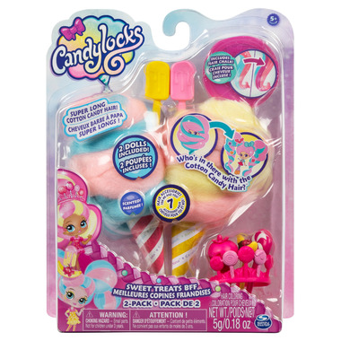 Who's in there with the cotton candy hair? It's Candylocks, scented collectible dolls with hair so soft, it looks just like cotton candy! This Sweet Treats BFF set includes two matching strawberry banana themed Candylocks dolls, Kerry Berry and Beau Nana! With 15 inches of colorful cotton candy-inspired hair wrapped around each doll, the Candylocks BFFs are hidden inside the pack! Open up the packaging and unravel each dollҒs hair to reveal the pair of Candylocks cuties and their hair accessories.
