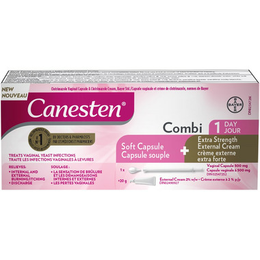 Canesten Combi 1 Day Vaginal Soft Capsule + Extra Strength External Cream is a complete, effective two-step treatment. The Soft Capsule, designed to be more comfortable to insert, cures most vaginal yeast infections after 1 vaginal application with relief of symptoms occurring in a few hours or days. The included extra strength cream provides extra relief of external symptoms.