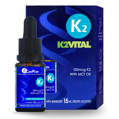 CanPrev’s K2 drops provides 30mcg of Vitamin K2 (MK-7) in each drop suspended in a medium chain triglyceride (MCT) oil base. MCT oil consists of stable fatty acids that enhance the absorption of fat-soluble nutrients, such as vitamin K2.