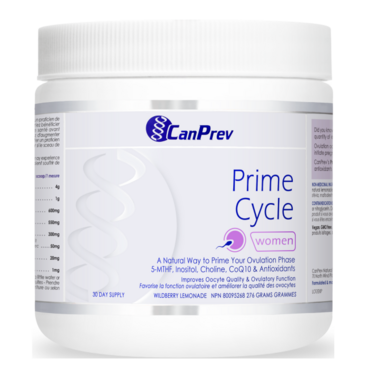 CanPrev’s Prime Cycle formula includes a therapeutic dose of myo-inositol to help support insulin sensitivity, a common factor behind PCOS which can impact fertility, while encouraging better egg quality and ovulation. Essential antioxidants like coenzyme Q10, pyrroloquinoline quinone and N-acetyl cysteine are added to help support cellular health and reduce oxidative damage. And chastetree extract to help balance hormones, active folate and choline for neural health and cellular development.