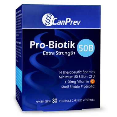 CanPrev’s Pro-Biotik 50B Extra Strength is a convenient, shelf stable, one-a-day probiotic with 14 clinical strains. Each strain has been specifically selected to enhance the gut microbiome by restoring favourable bacteria for better digestive health after gastrointestinal upset or antibiotic use. Keep a box of Pro-Biotik 50B in your bag and know with confidence that your probiotics can keep up, wherever life takes you.