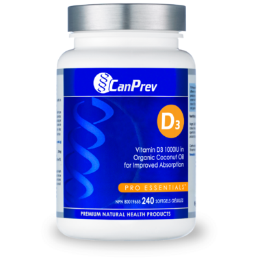 D3 assists the body in the absorption and utilization of calcium and supports the development and maintenance of bones and teeth.  CanPrev Vitamin D3 softgels are made with an organic coconut oil base.