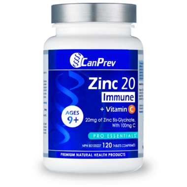 CanPrev’s Zinc 20 Immune + Vitamin C feature highly absorbable zinc bis-glycinate and pure vitamin C ascorbic acid, nutrients essential to good health and immune function. Delivered in a tablet format and in a dosage that’s suitable for ages nine and up!