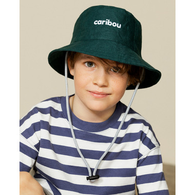 Linen bucket hat for added protection. The visor wraps around the head, protecting the back of the neck from the sun, while the adjustable drawstring keeps the hat secure. Embroidery on the front panel.