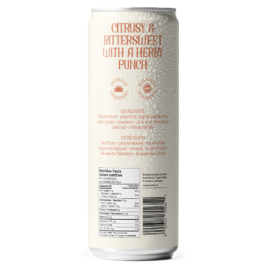 Sparkling water, grapefruit sugar (100% organic blue agave nectar), lime, herbs, citric acid, Himalayan pink salt