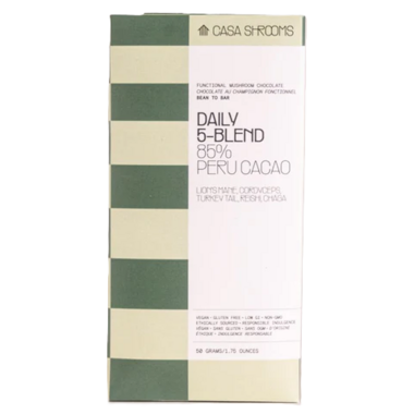 Daily-5 Blend Chocolate Bar combines the power of mushrooms with the delicious taste of 85% dark chocolate. Sweetened with natural coconut flour nectar, its a treat that supports your health without compromising on taste.