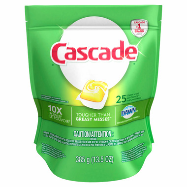 - Cascade ActionPacs power away greasy residue for sparkling dishes