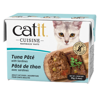 Water sufficient for processing, tuna, sardines, carrots, peas, fish oil, carrageenan, olive oil, guar gum, magnesium silicate, zinc oxide, choline chloride, iron carbonate, manganous oxide, copper sulfate, niacin, d-calcium pantothenate, potassium iodide, calcium carbonate, vitamin B1 (thiamine hydrochloride), vitamin B6 (pyridoxine hydrochloride), vitamin B2 (riboflavin), folic acid, biotin, vitamin B12.