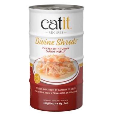 There is no finer complement to your cats daily diet than Catit Divine Shreds in Jelly. These soft morsels of chicken or tuna paired with appetizing vegetables are served in hydrating jelly, available in 8 grain-free varieties.