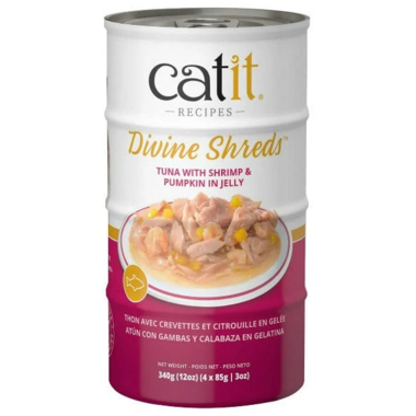 There is no finer complement to your cats daily diet than Catit Divine Shreds in Jelly. These soft morsels of chicken or tuna paired with appetizing vegetables are served in hydrating jelly, available in 8 grain-free varieties.